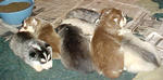 For bath time, we use Plush Puppy shampoos and conditioners. There are different formulas for different coat colors and different purposes (such as keeping whites white). Get Shampoo, Conditioner, and we really like the Conditioning Mousse. You can order here: http://www.iodogs.com or email kristari@aol.com For brushing/combing, you will want to get a steel comb that has wider spaced teeth on one side, and narrower spaced teeth on the other. Any wire ended brush will do for routine brushing. Comb: 'Classic Combination Comb' http://www.carealotpets.com Brush: 'Large Comfort Tip Brush' http://www.carealotpets.com When a Siberian blows coat (usually about twice a year), it is a mess. If you are unfamiliar with this breed characteristic, please visit our 'Breed Characteristics' page. When this happens, you can brush from sun-up until sun-down and it seems like the fur will still be coming out. During this period, it is advisable to wet your dog down, and blow dry large amounts of the fur out, while combing at the same time. For this, you will want to order a hair dryer for dogs, or reverse the action on a shop-vac. A human hair dryer does not have the force needed to blow the hair out. Since this can also be messy and time consuming, you may decide just to take your dog to a groomer in an effort to reduce the amount of hair that you are vacuuming up and combing out yourself. Many of these items can be found at: http://www.carealotpets.com or one of the other dog product supply stores. Dryer: Grooming Table: Grooming Apron: *Note: Bathe your Siberian regularly as a puppy. Some Siberians LOVE bath time, and others do not. If you have one that does not, and wait until he/she is older for his/her first bath, you may have your hands full! With the amount of digging that young Siberians like to do, odds are that you will be doing that anyway!